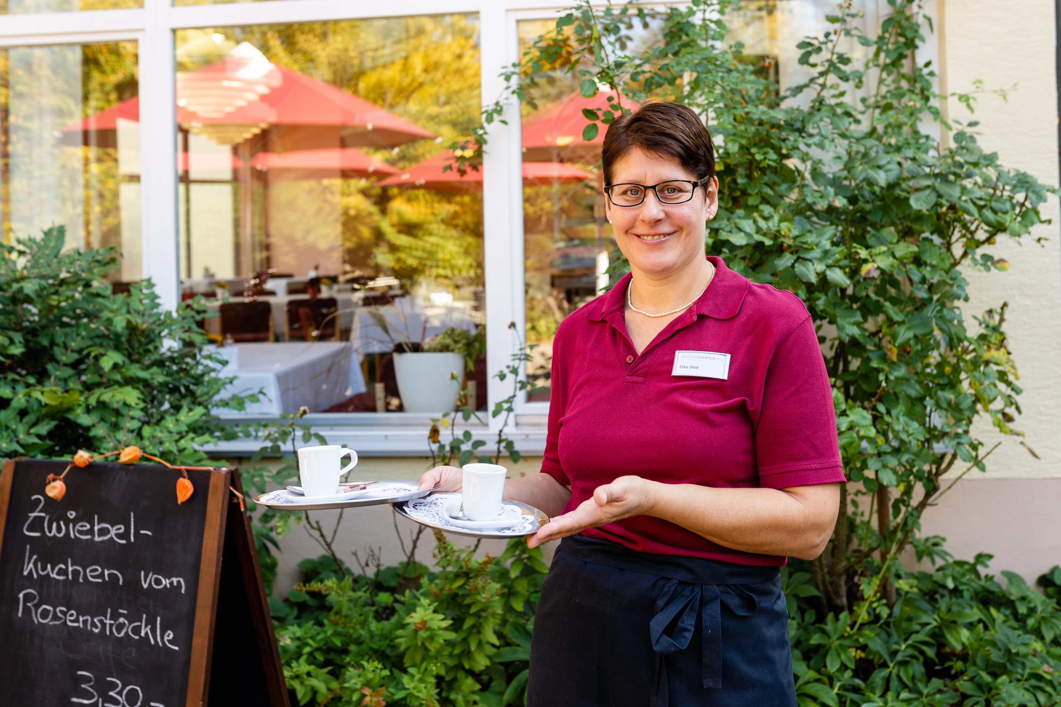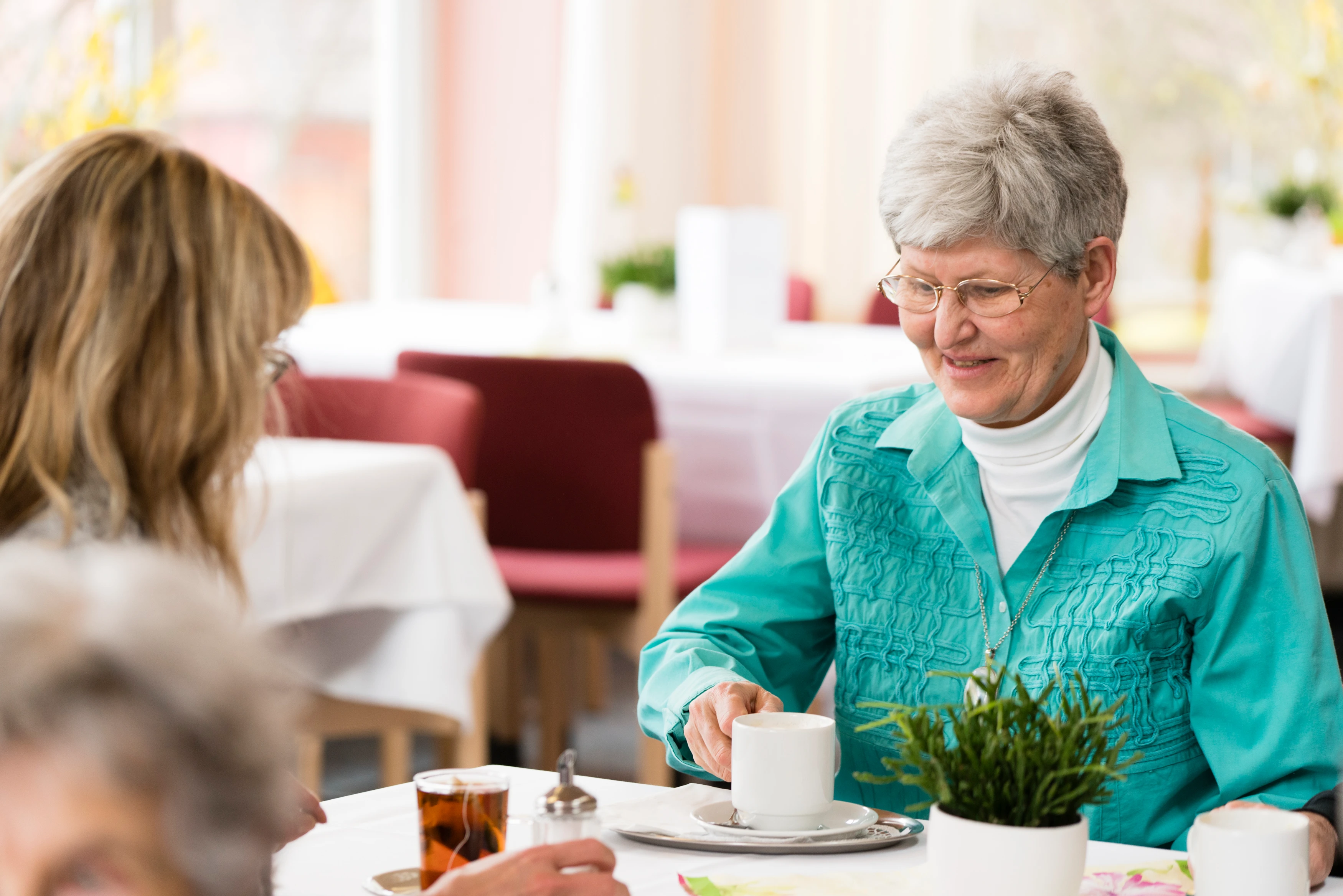 In unserem täglich geöffneten und liebevoll gestalteten Café können Bewohner und Bewohnerinnen mit ihren Angehörigen und Freunden – auch externe Besucher:innen sind willkommen – genussvolle und kurzweilige Nachmittage verbringen, im Sommer selbstverständlich auch auf der sonnigen Gartenterrasse neben dem Haupteingang.